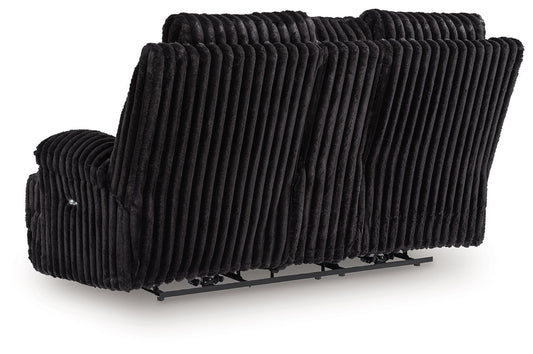 Elonzo - Power Motion Loveseat With Console, LED, Power Headrest & Speaker - Light Gray