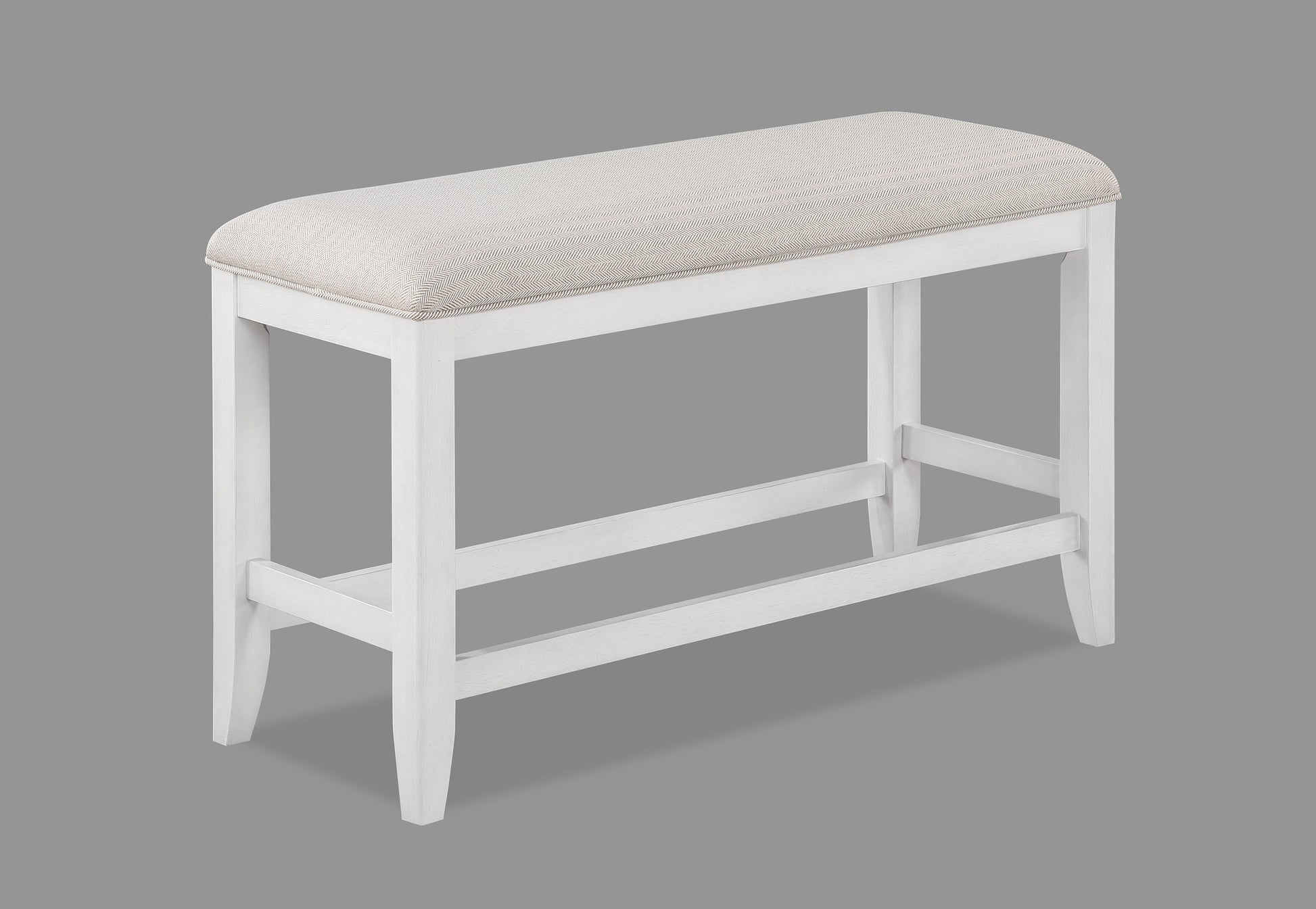 Bring a fresh look to your dining space with this breezy counter height group. The table has an array of design features, including drawers, bottle storage, and an open bottom shelf. Ladderback chairs and bench are upholstered in a Chevron pattern fabric with piping detail.